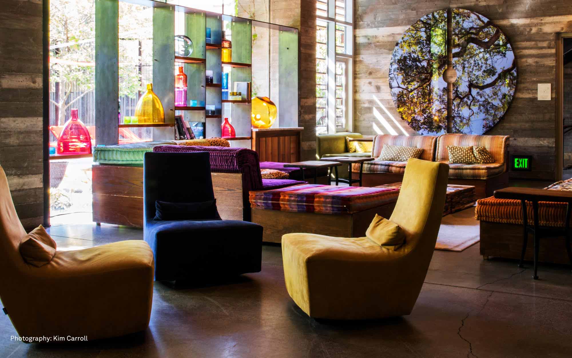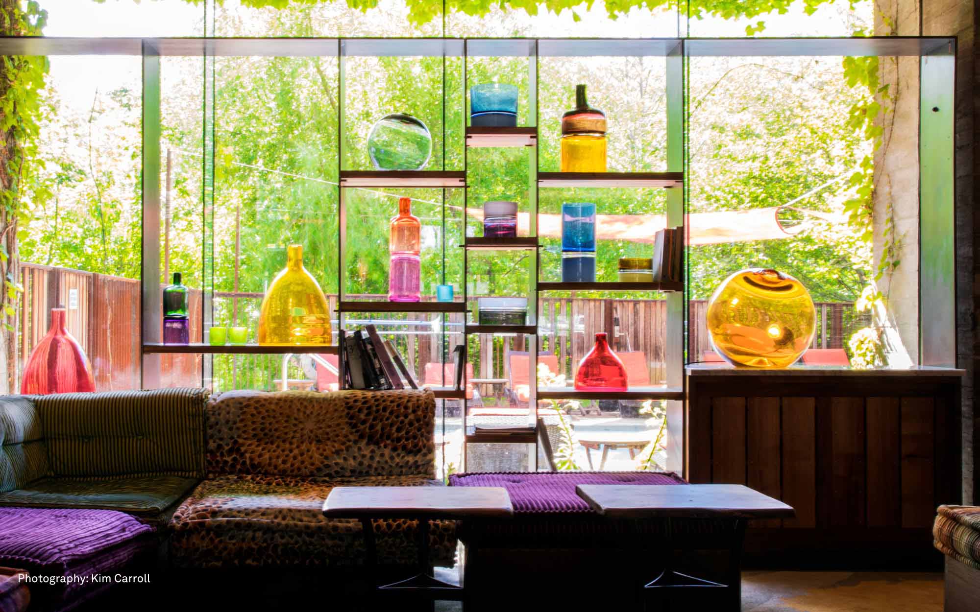 Like the SkLO US headquarters, the h2hotel is located in Healdsburg, California. In 2015, Circe Sher – a partner at Piazza Hospitality, which owns and operates many of the boutique hotels in the area including the h2 – approached SkLO to help style a large, open steel shelving unit in the hotel’s lobby. SkLO partner and lead designer Karen Gilbert worked with Sher to curate a selection of SkLO glass for the space.