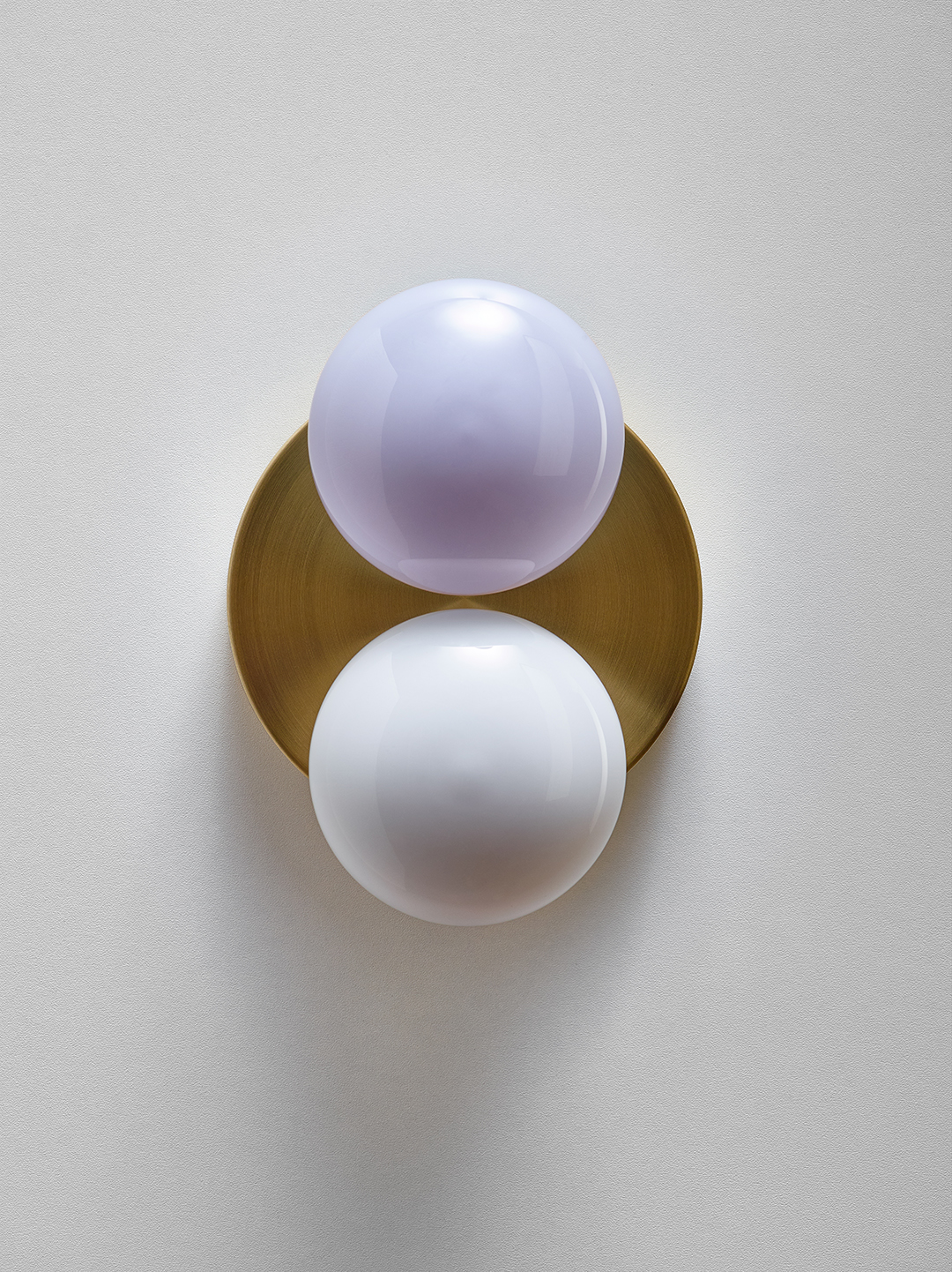 Oyster and White glass, Brushed Brass metal finish, shown “off”