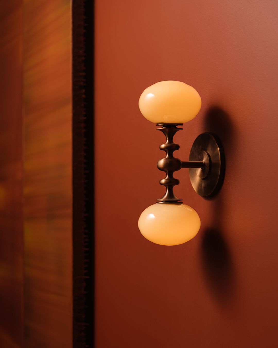 White glass, brushed brass metal finish, profile 2, shown “off”