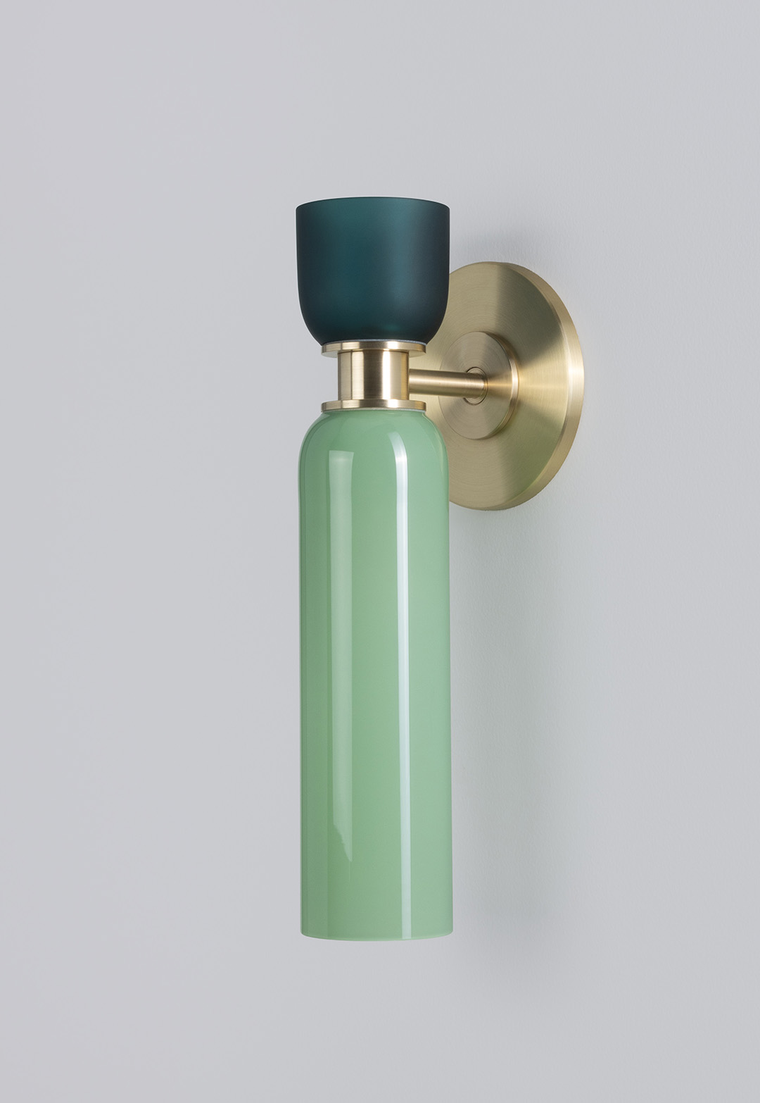 The designs of the Union lighting series combine upward- and downward-oriented glass dome shapes of different proportions in carefully curated palettes that mix color, transparency, and texture. The Union Sconce combines a long, narrow, lit dome of opaque glass on the lower half with a smaller, upward-facing dome of frosted glass. The two domes are separated by a brass element featuring classic detailing. The Union Sconce offers a meaningful presence in a modest package. Available in multiple glass color combinations, and brass hardware finishes. Part of the SkLO + AvroKO collection – a collaboration between SkLO and the AvroKO Partners.