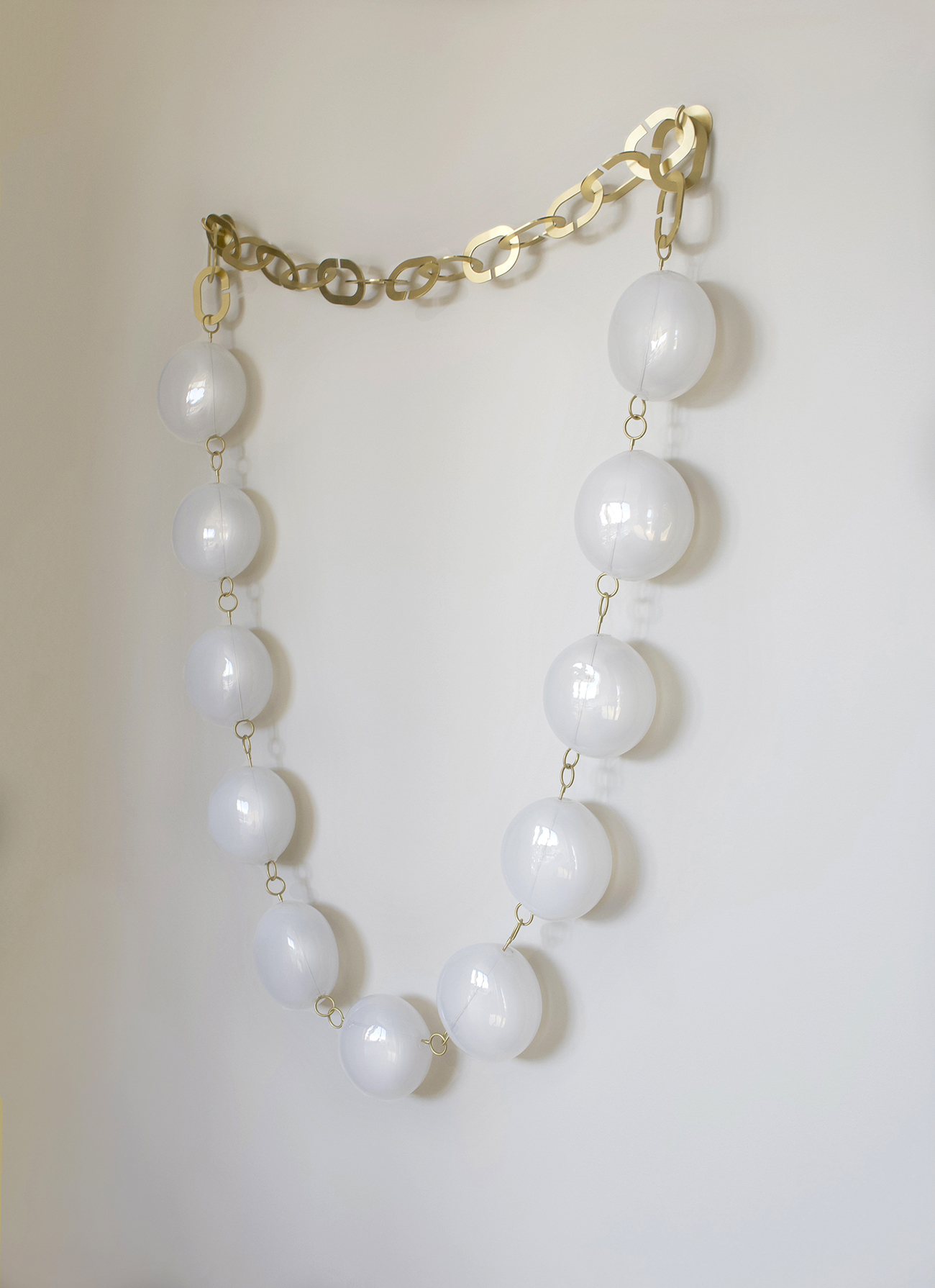 A large wallpiece sculpture with oversized glass beads suspended along a length of brass links. With an expressive brass chain across the top, the wallpiece is suspended from two points on custom hardware (included). The piece drapes dramatically, a stylish wall sculpture. All glass dimensions are approximate – handblown glass dimensions vary by nature and intent. Made in the Czech Republic.