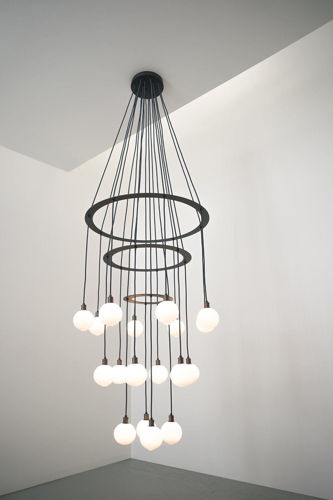 The SkLO take on the classic tiered chandelier brings chandelier typology into a modern, minimal look. The ability of this simple chandelier to take on infinite different compositions by changing the locations and relationships between the different rings and the rings and their pendants is what makes this chandelier so impressive. Using multiple smaller elements to achieve a larger whole is a hallmark of SkLO design. It works just as well within classic and historic interiors as well as it does within modern ones.
